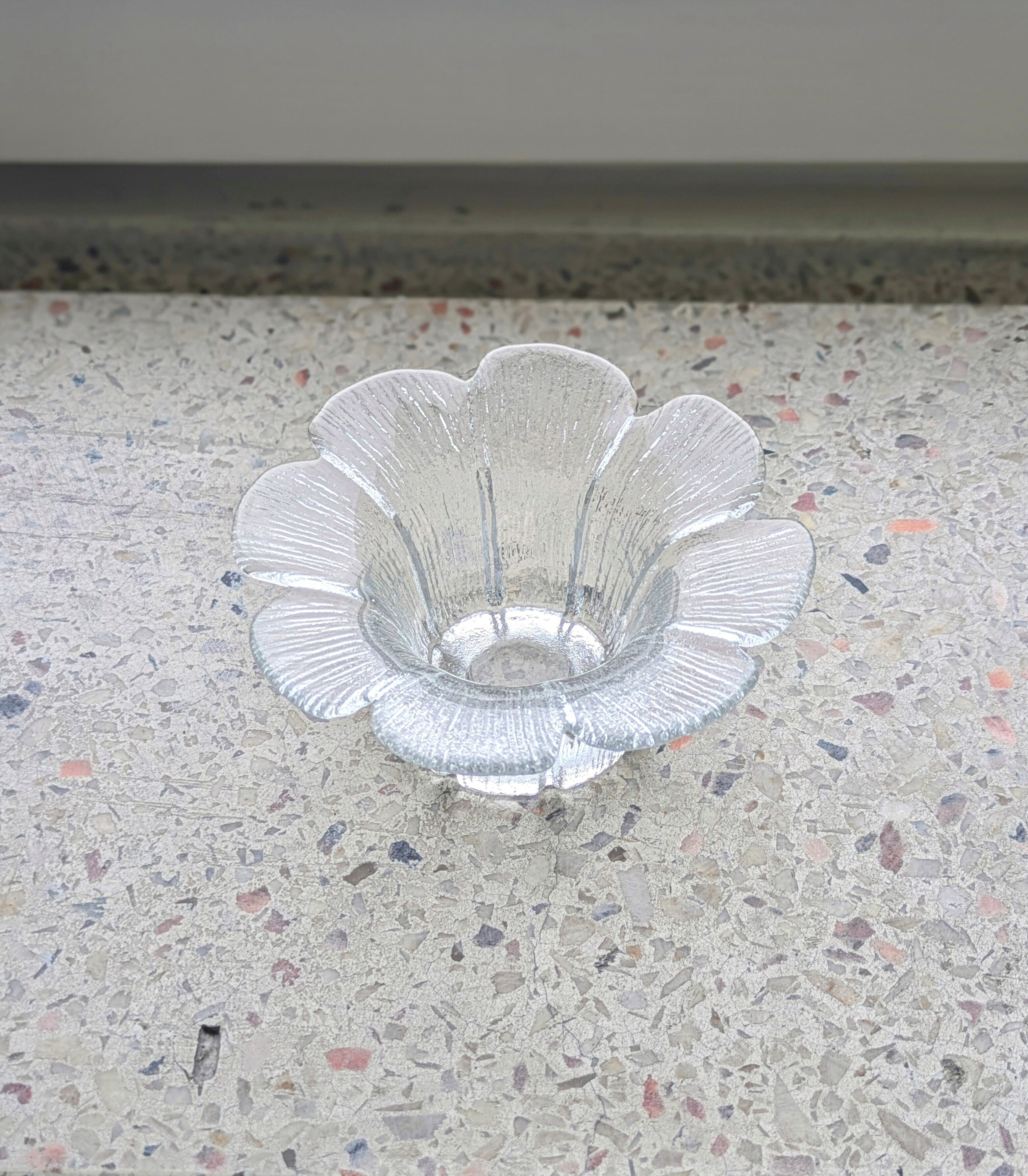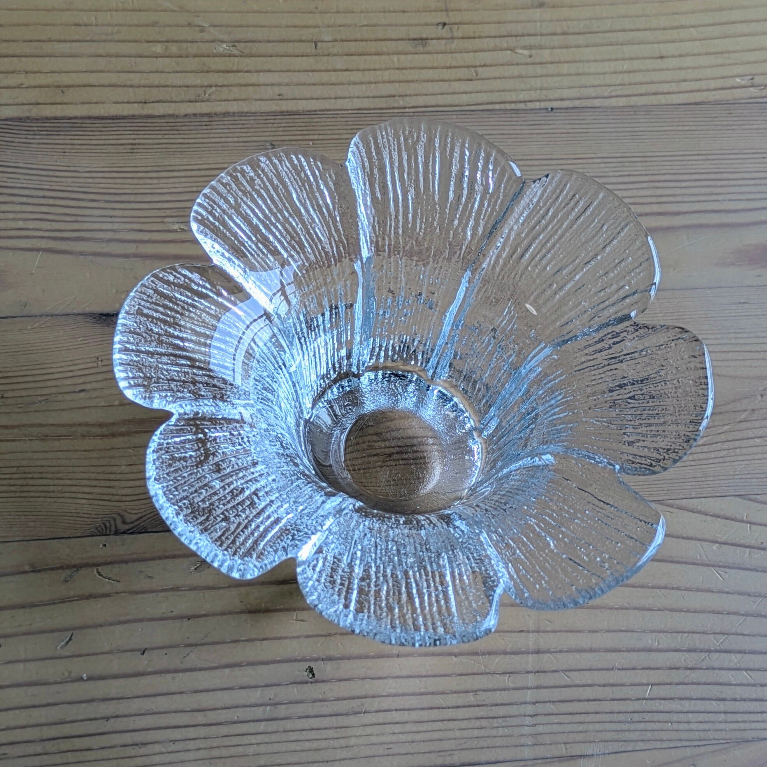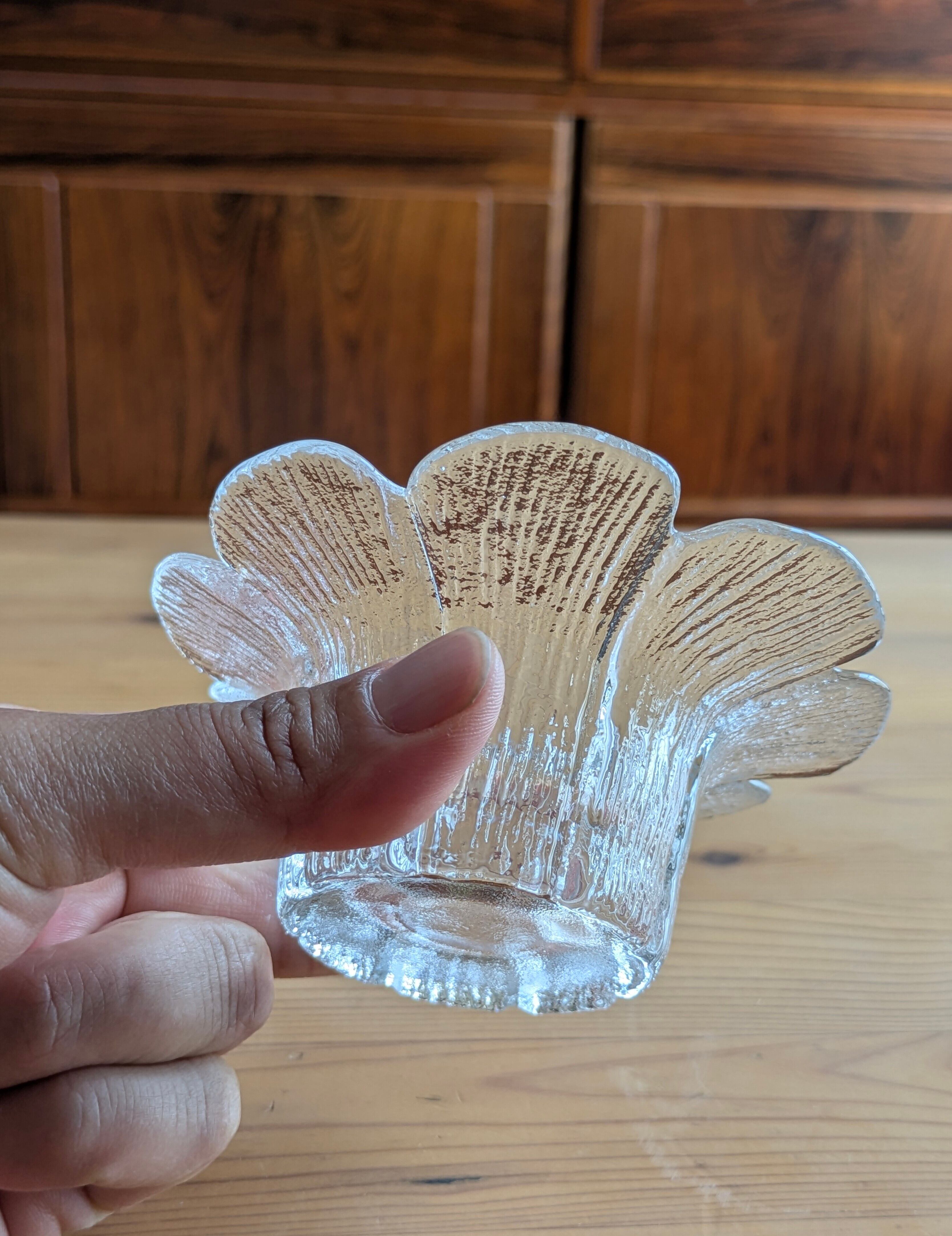 このガラスの器は厚めのガラスに凹凸で線が描かれ、上から見ると花のように見え、光が当たるとその影もきれいです。