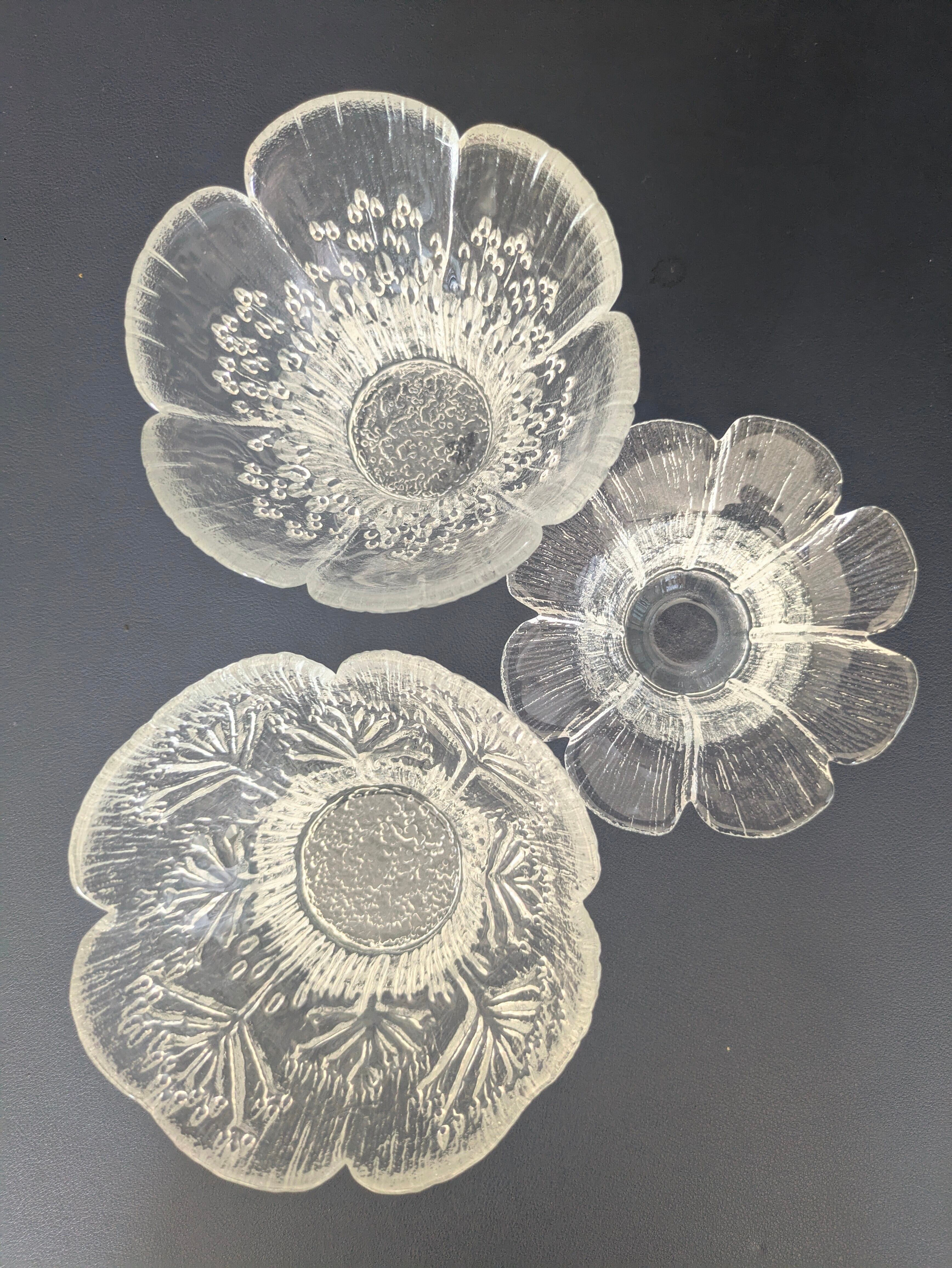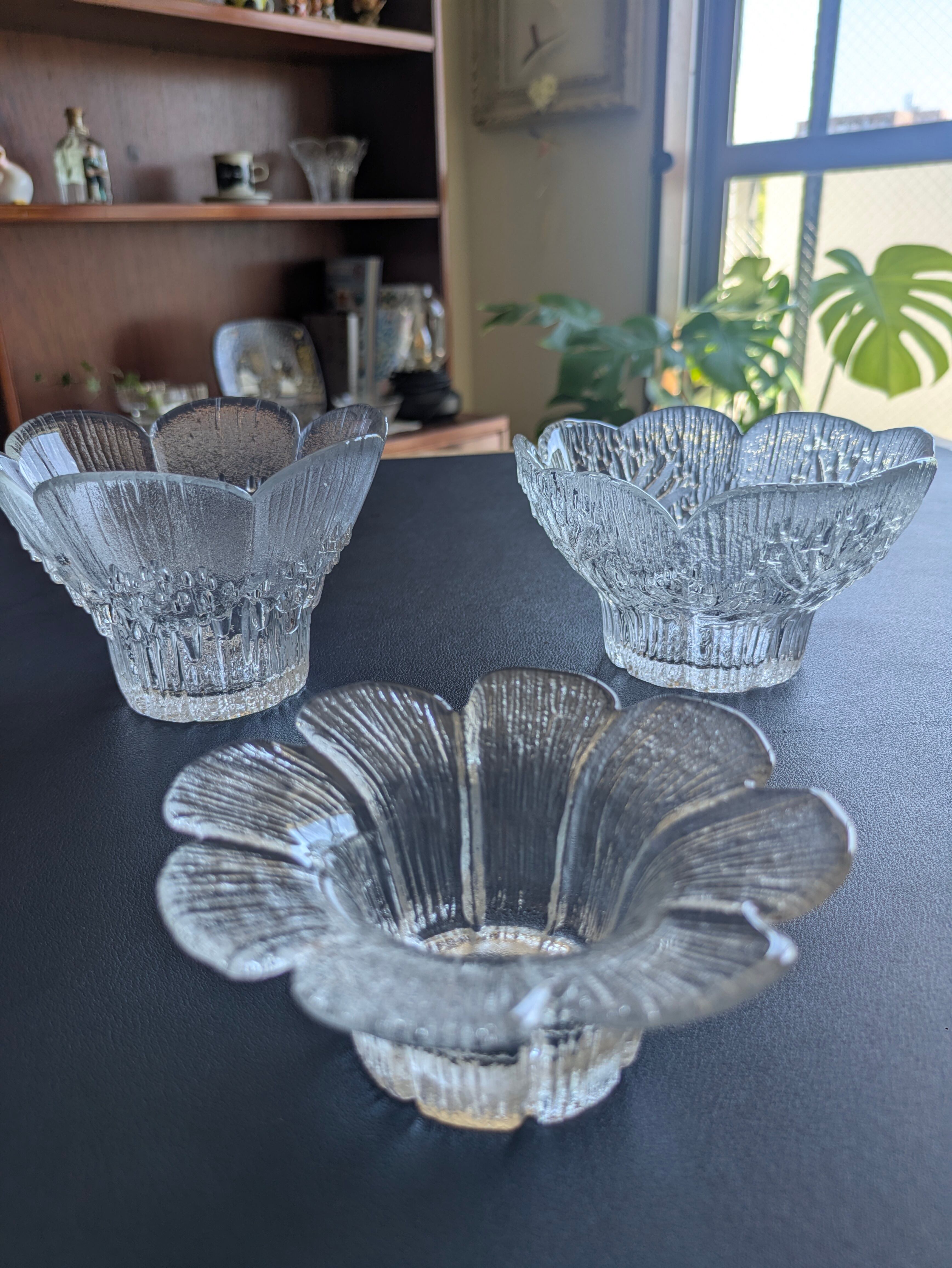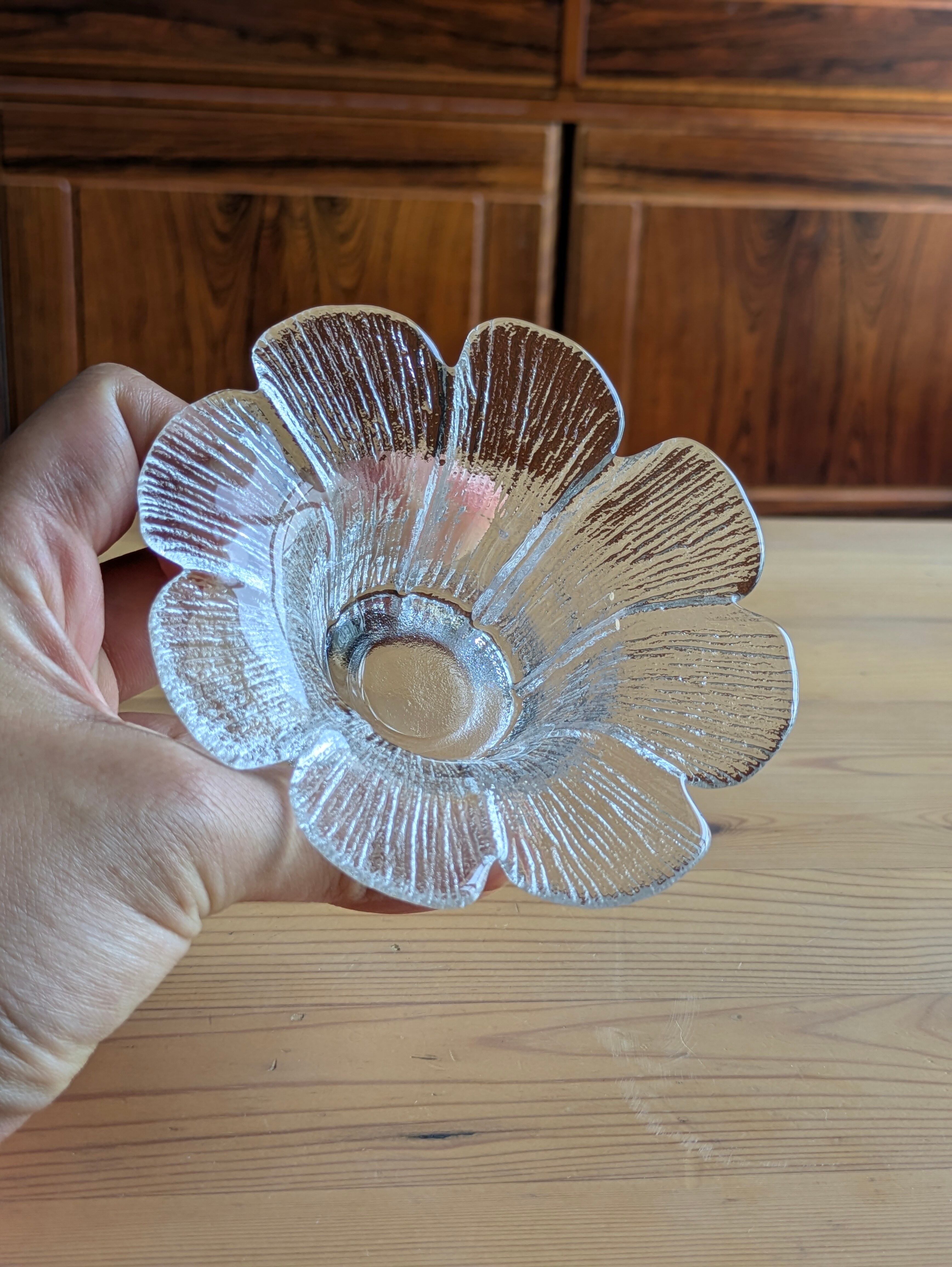 このガラスの器は厚めのガラスに凹凸で線が描かれ、上から見ると花のように見え、光が当たるとその影もきれいです。
