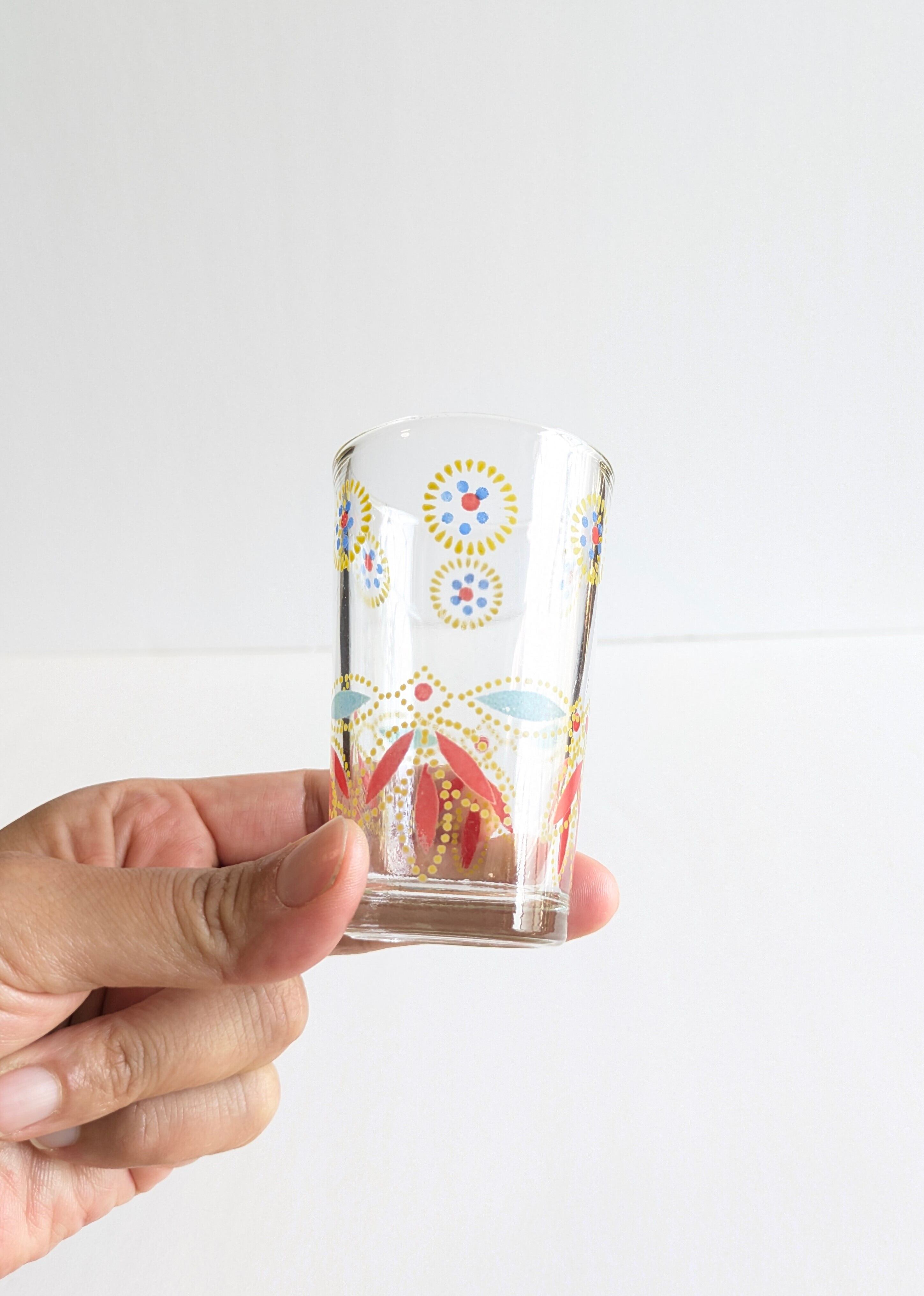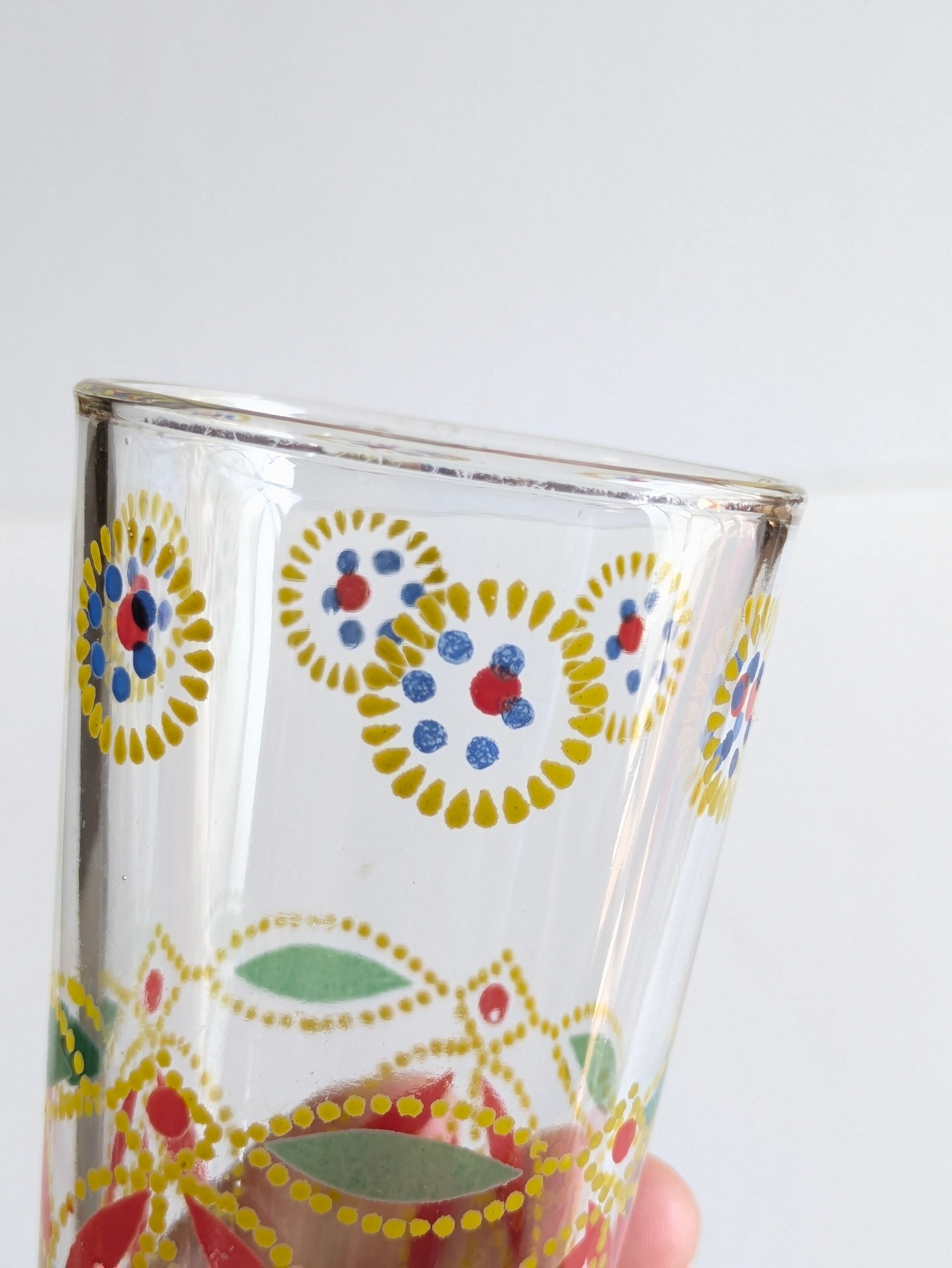 スウェーデンで見つけたカラフルなミニグラスのペアです。小ぶりでカラフルなペイントのグラスは日々の食卓を彩る存在となるでしょう。特に食前酒など少量の飲み物を楽しむのに最適なサイズです。