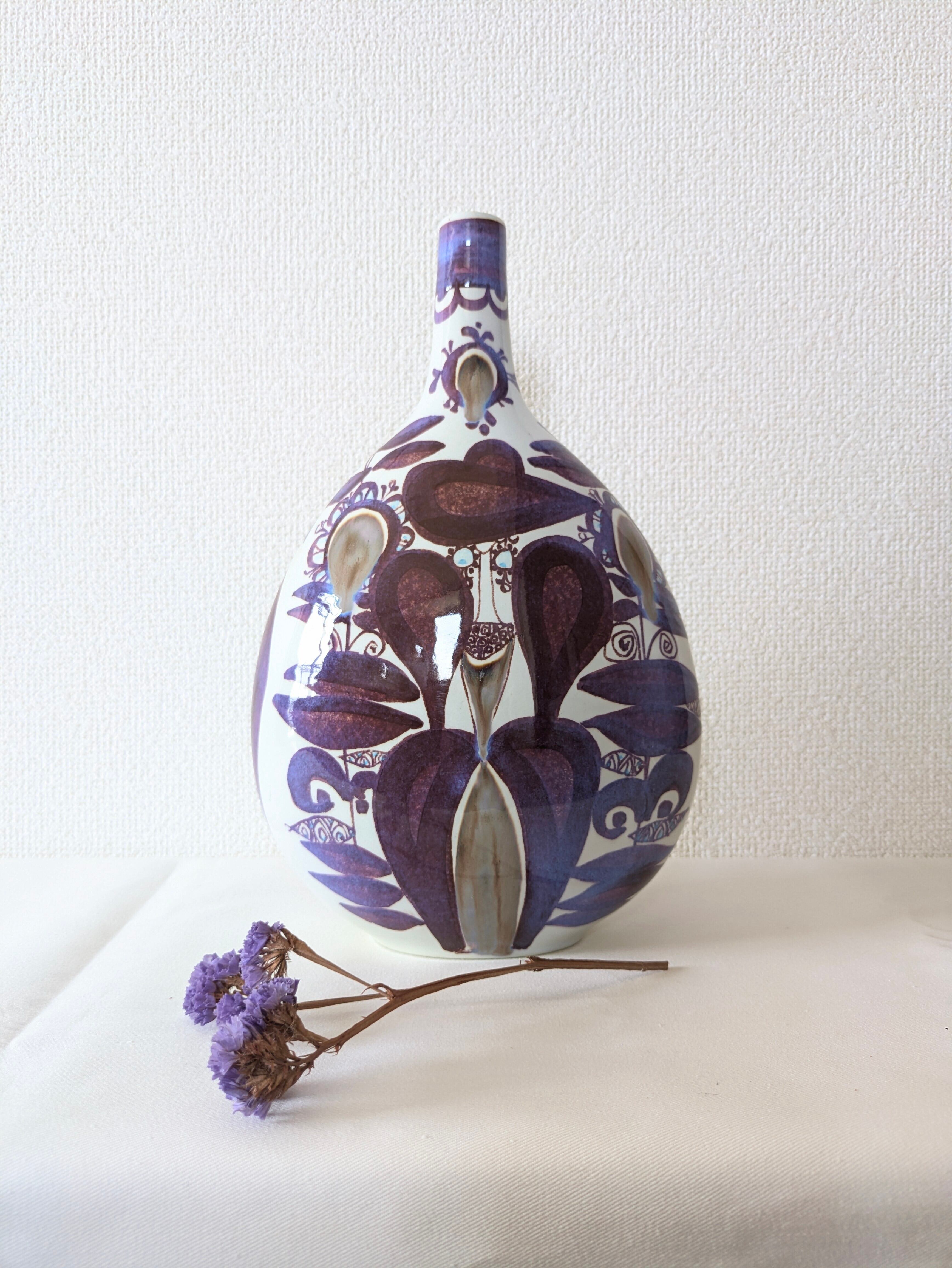 パープルを基調とした素敵な色使いでダイナミックな筆使いがフォルムによく映えています。お花があってもなくても、魅力的なフラワーベースです。