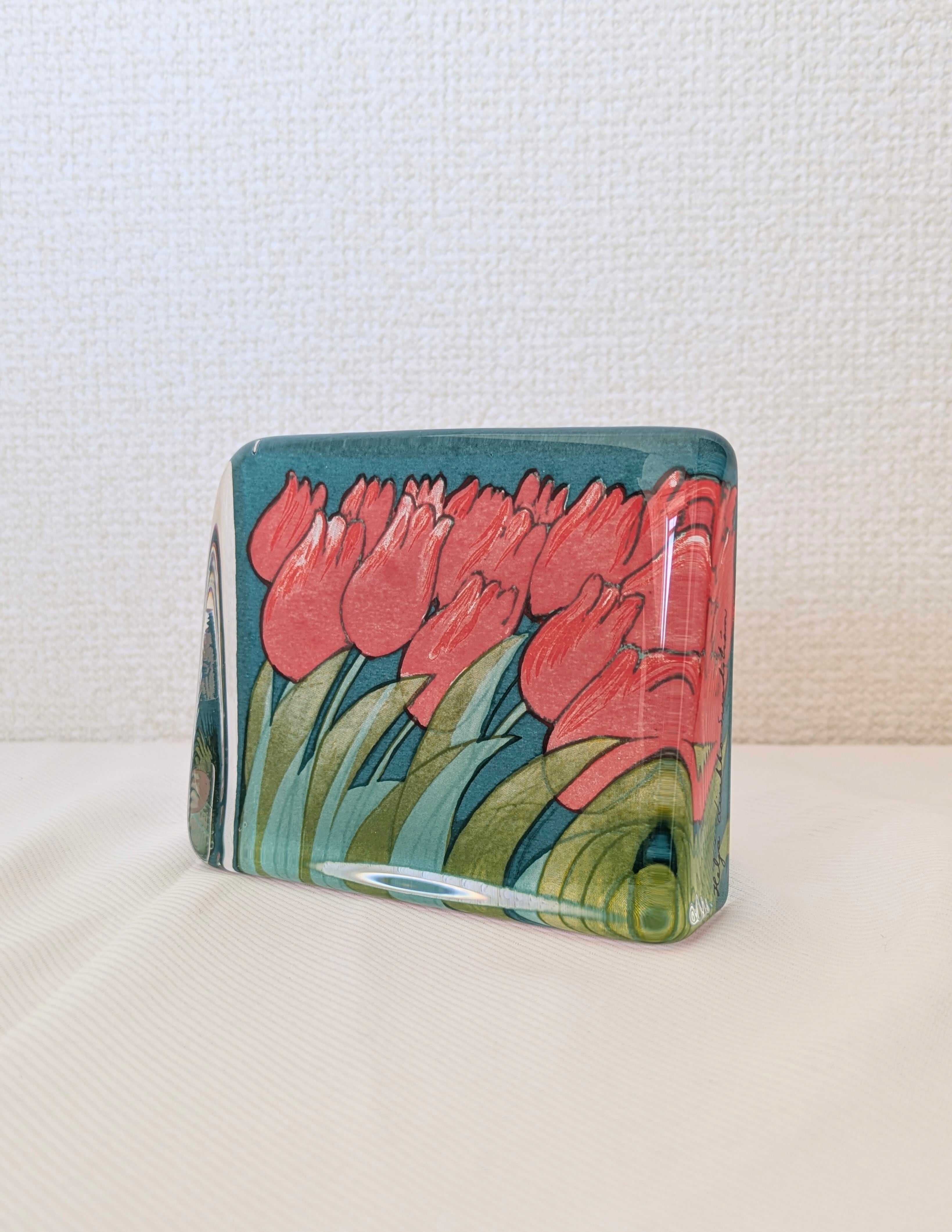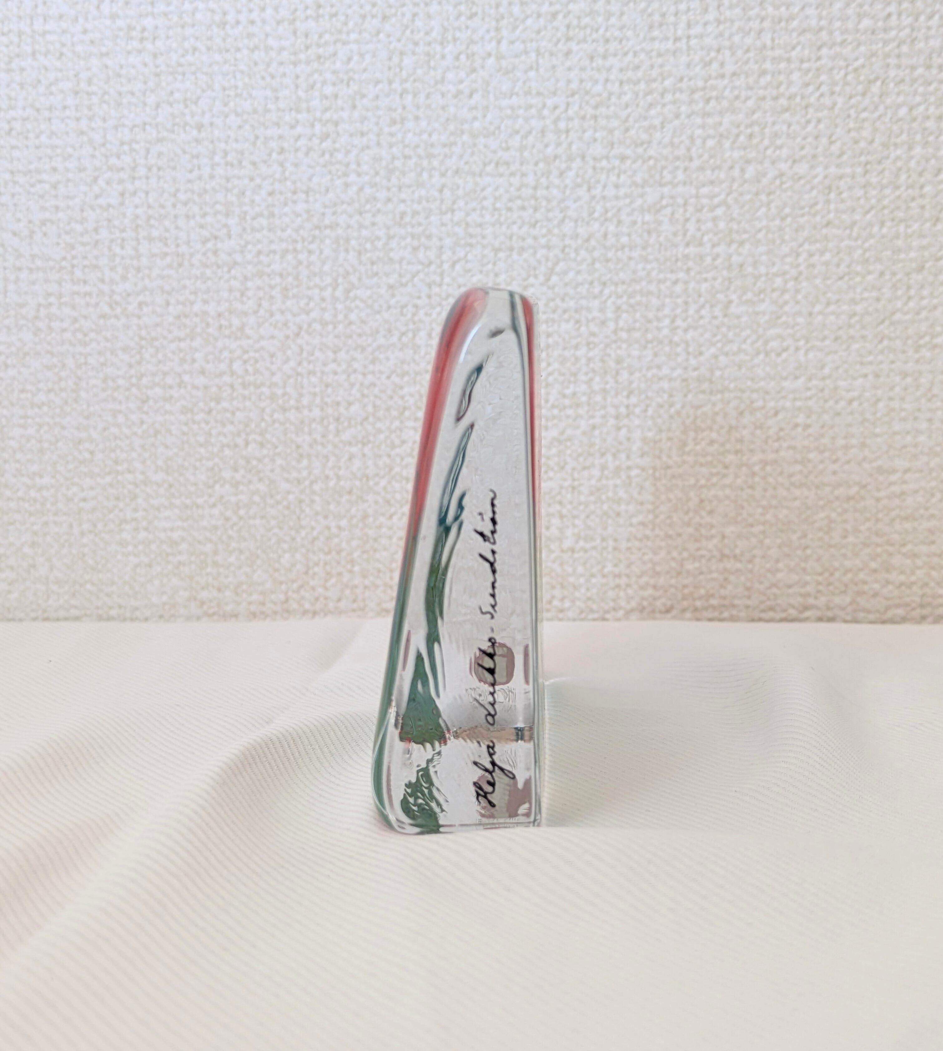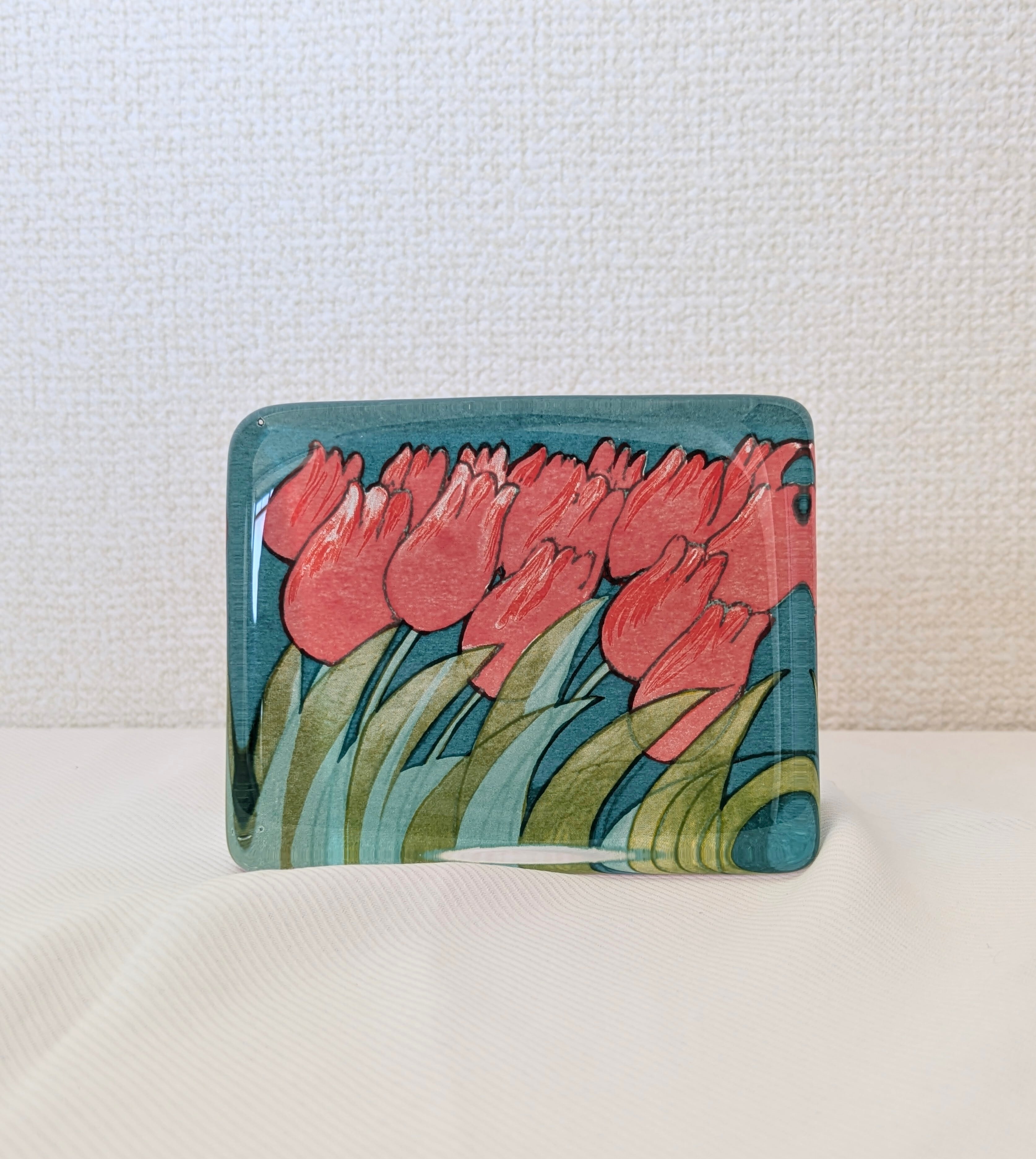 細長い台形状のガラスの背面に絵がプリントされていて、陽に当たると鮮やかに反射してとてもきれいです。