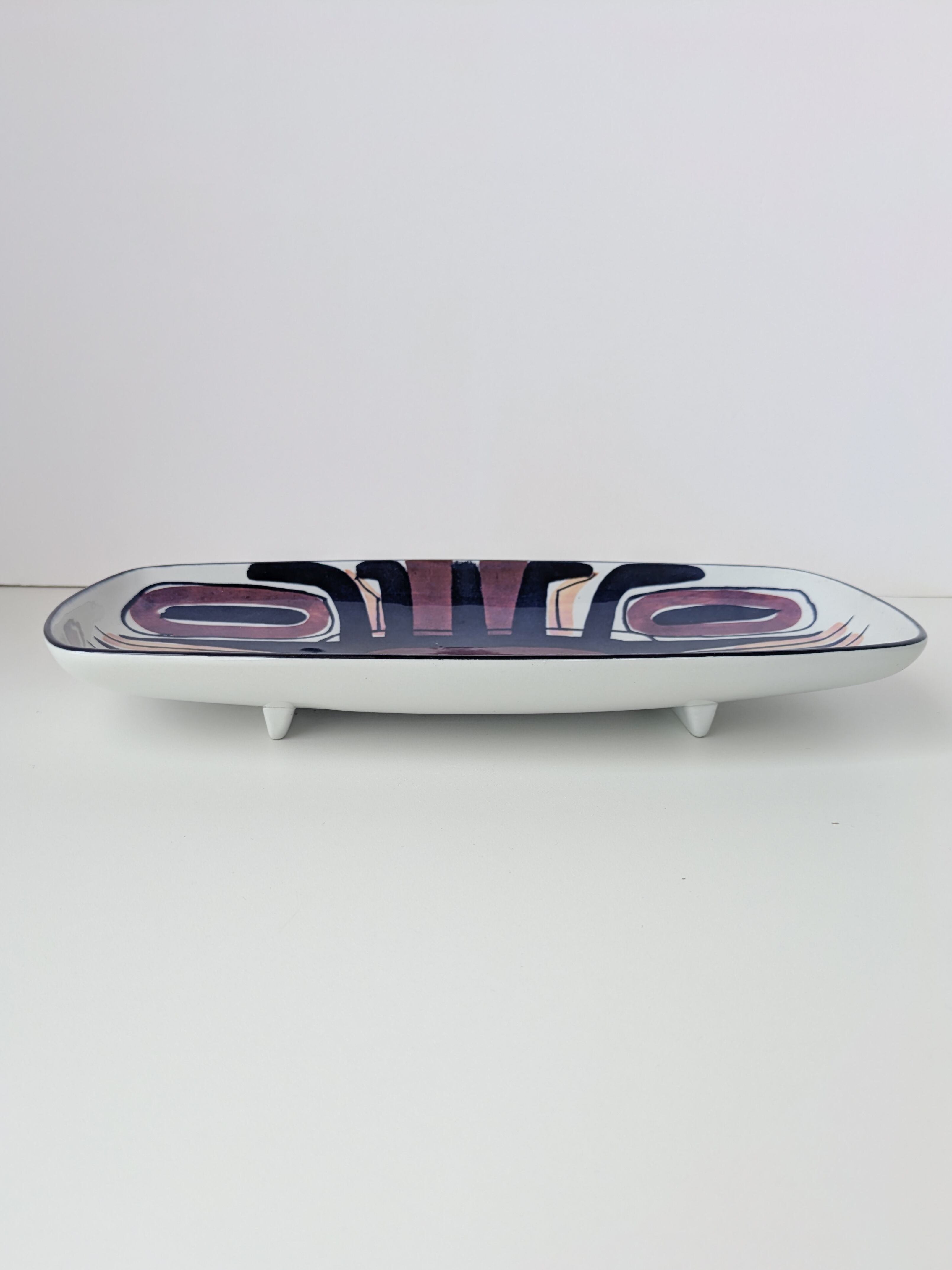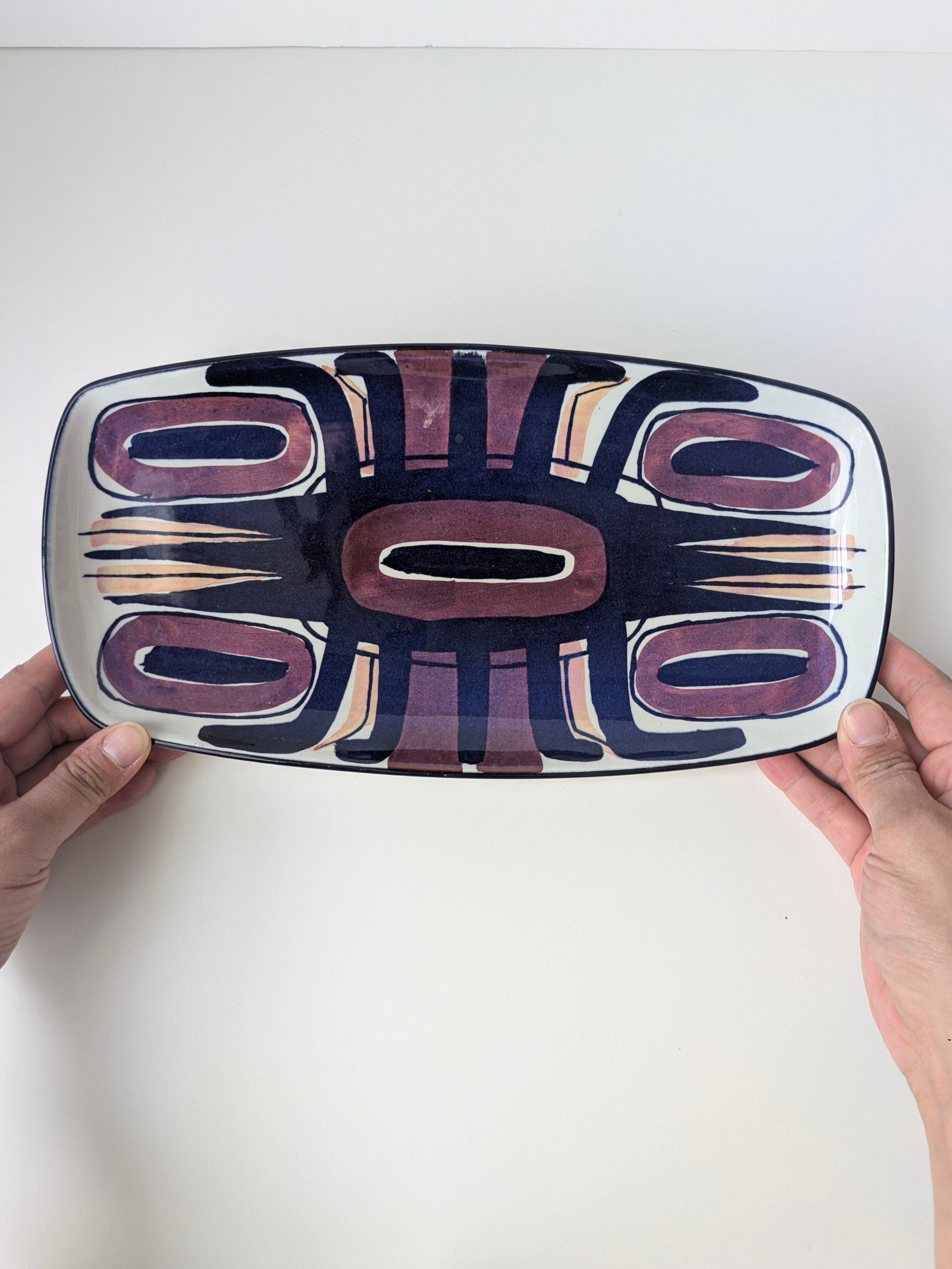 Royal Copenhagen(ロイヤルコペンハーゲン)の「テネラ」シリーズの長大皿です。ぽってりとした丸みのあるフォルムに、幾何学模様がデザインされており、ブルーやパープルの華やかな雰囲気です。