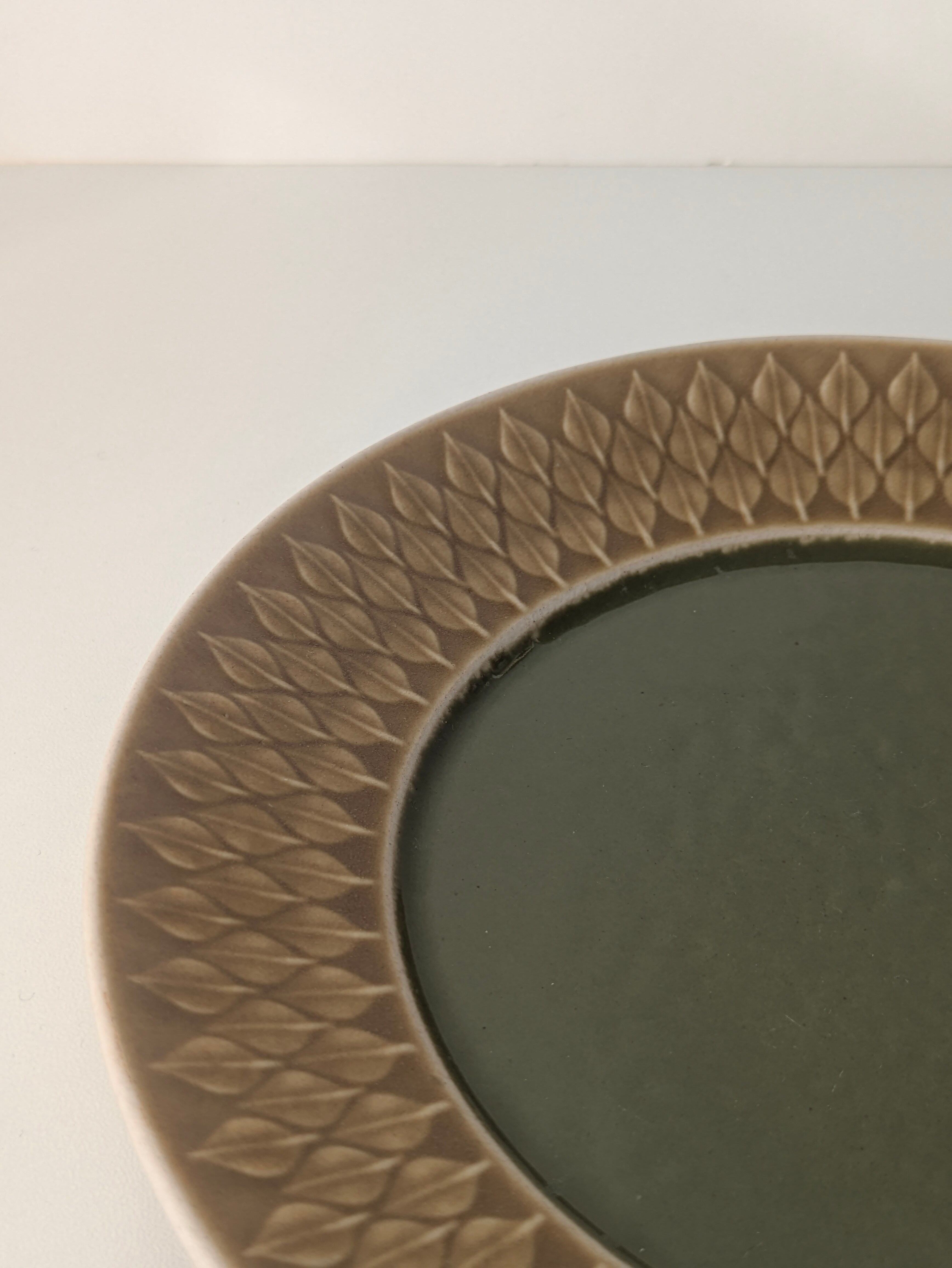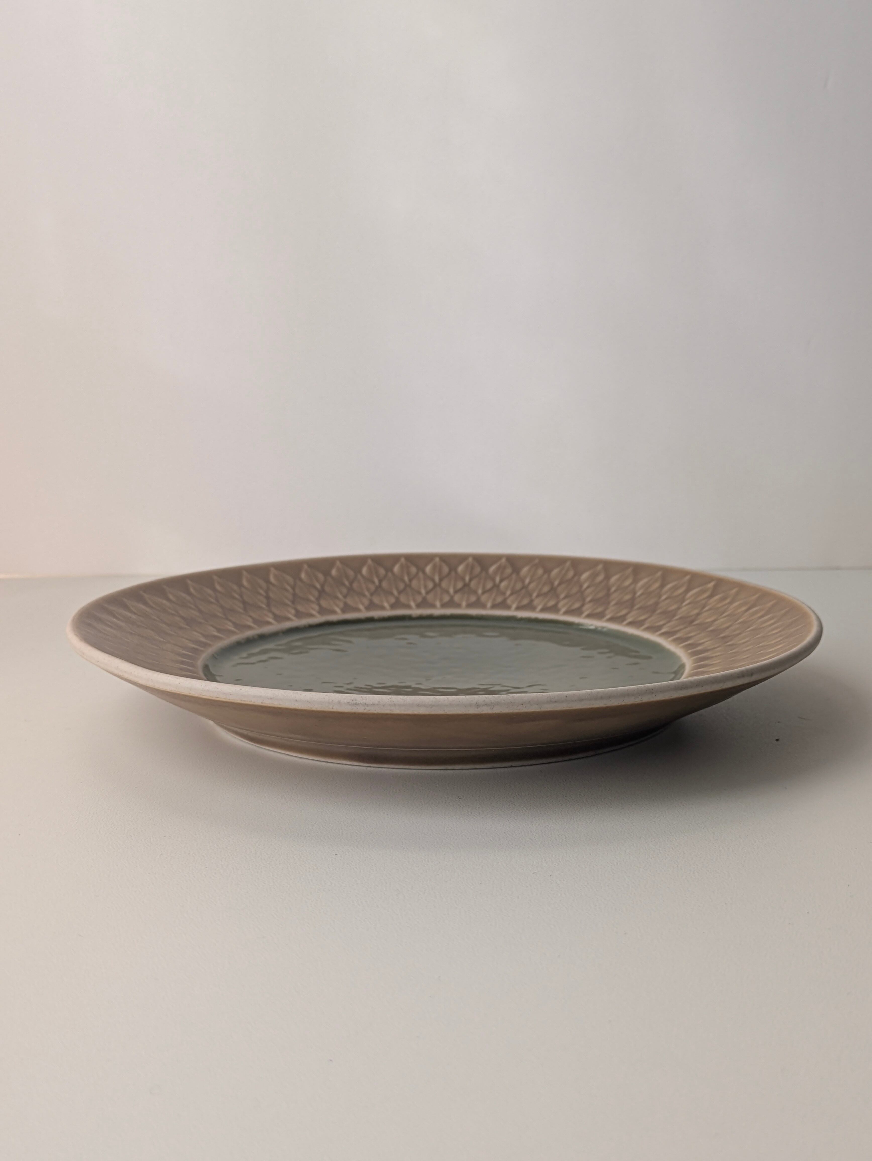 中央の艶々としたモスグリーンがレリーフのモチーフのマットな質感と対比したユニークなアイテム。縁が広めにとられており、葉の模様が堪能できます。