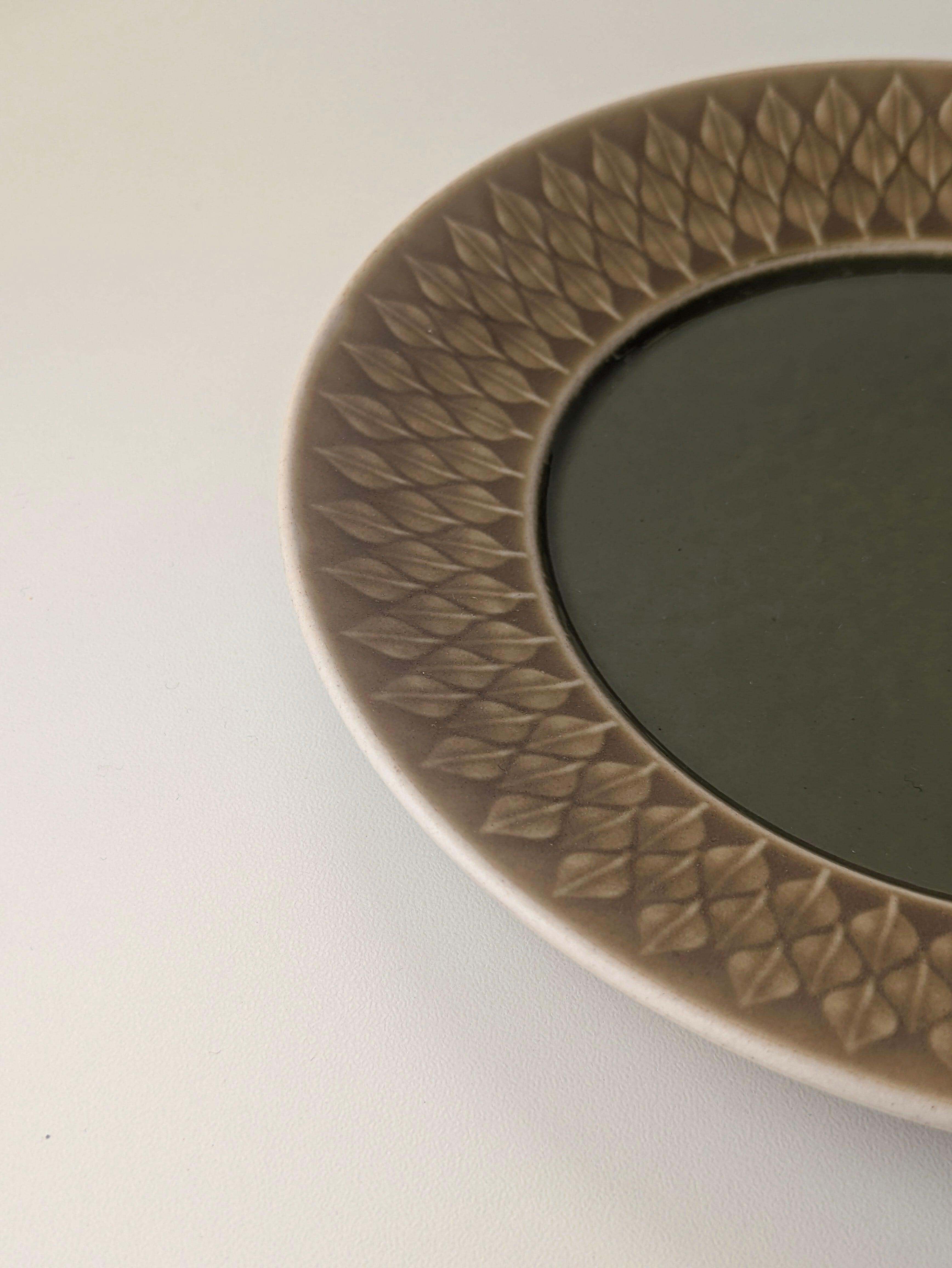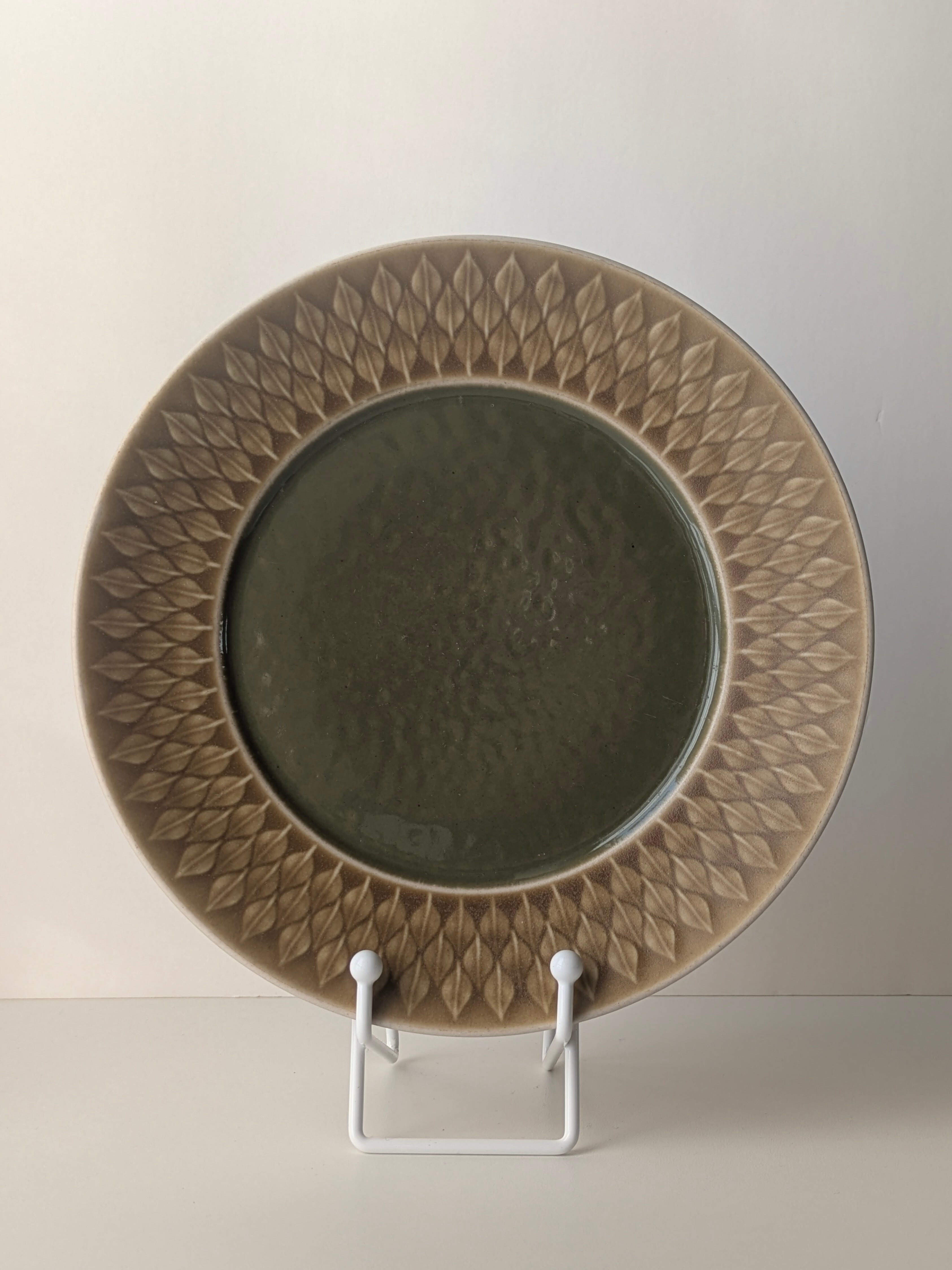 中央の艶々としたモスグリーンがレリーフのモチーフのマットな質感と対比したユニークなアイテム。縁が広めにとられており、葉の模様が堪能できます。