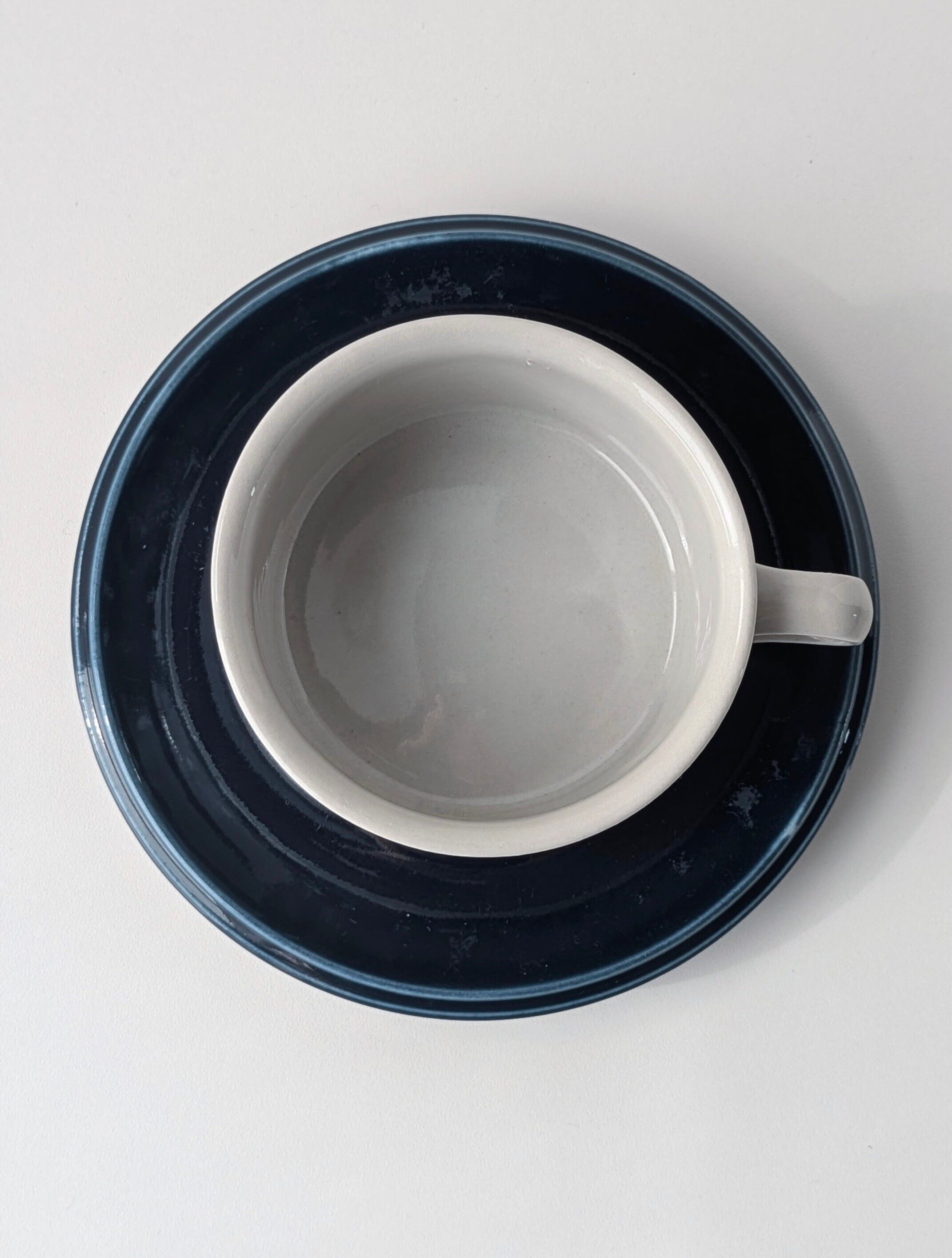 通常品の白いソーサーは、ソーサーのブルーのラインとカップに描かれたアネモネの花が際立つ造りですが、ブルーソーサーはカップの白が際立つと同時に、アネモネの花の色味に深みが加わり、一層の一体感が生まれます。